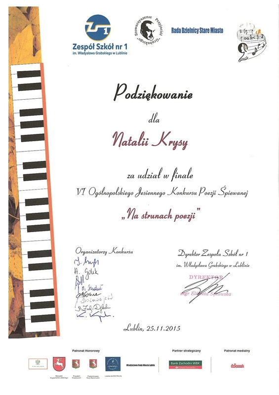 25 listopada w auli Zespołu Szkół nr 1 im. W. Grabskiego w Lublinie odbyły się finałowe przesłuchania uczestników VI Ogólnopolskiego Jesiennego Konkursu Poezji Śpiewanej „Na strunach poezji". Następnego dnia tj. 26 w auli Caritas Archidiecezji Lubels czytaj więcej..