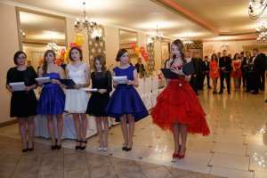 Rozbrzmiały dźwięki poloneza, w pierwszej parze szedł pan dyrektor Krzysztof Galan z Anitą Woźniak, a w następnej pani wice dyrektor Aldona Zdun. Młodzież wspaniale zaprezentowała cały układ poloneza, dziewczęta wystąpiły z czerwonymi różami, które wcześniej otrzymały od swoich partnerów.