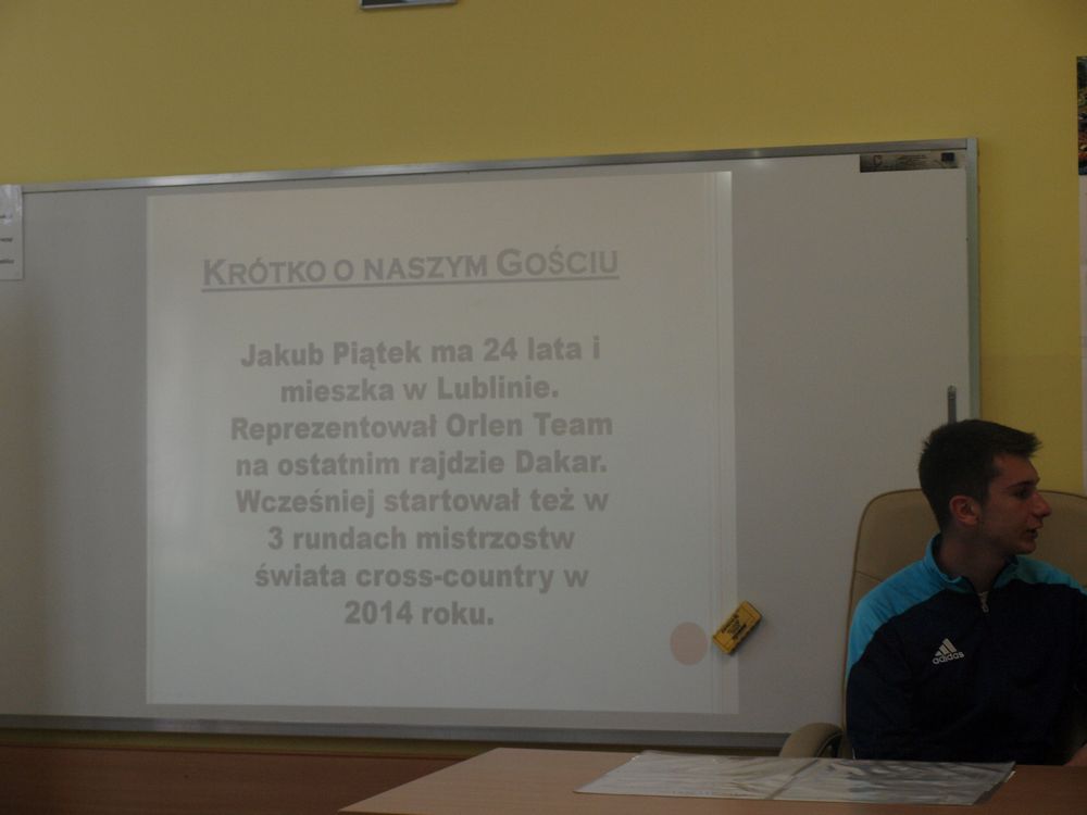 Dnia 2 czerwca bieżącego roku klasy logistyczne wzięły udział w spotkaniu z uczestnikiem Rajdu Dakar - Jakubem Piątkiem. Organizatorem spotkania były E. Głowacka- Żuk i G. Szwajewska. Jakub zaczął swoją przygodę dość wcześnie, gdyż w wieku 3 lat miał już pierwszy motocykl, co prawda był to elastyczny model, lecz w zupełności mu wystarczył. W wieku 11 lat zdał egzamin na licencje sportową i rozpoczął starty w poważniejszych przedsięwzięciach.