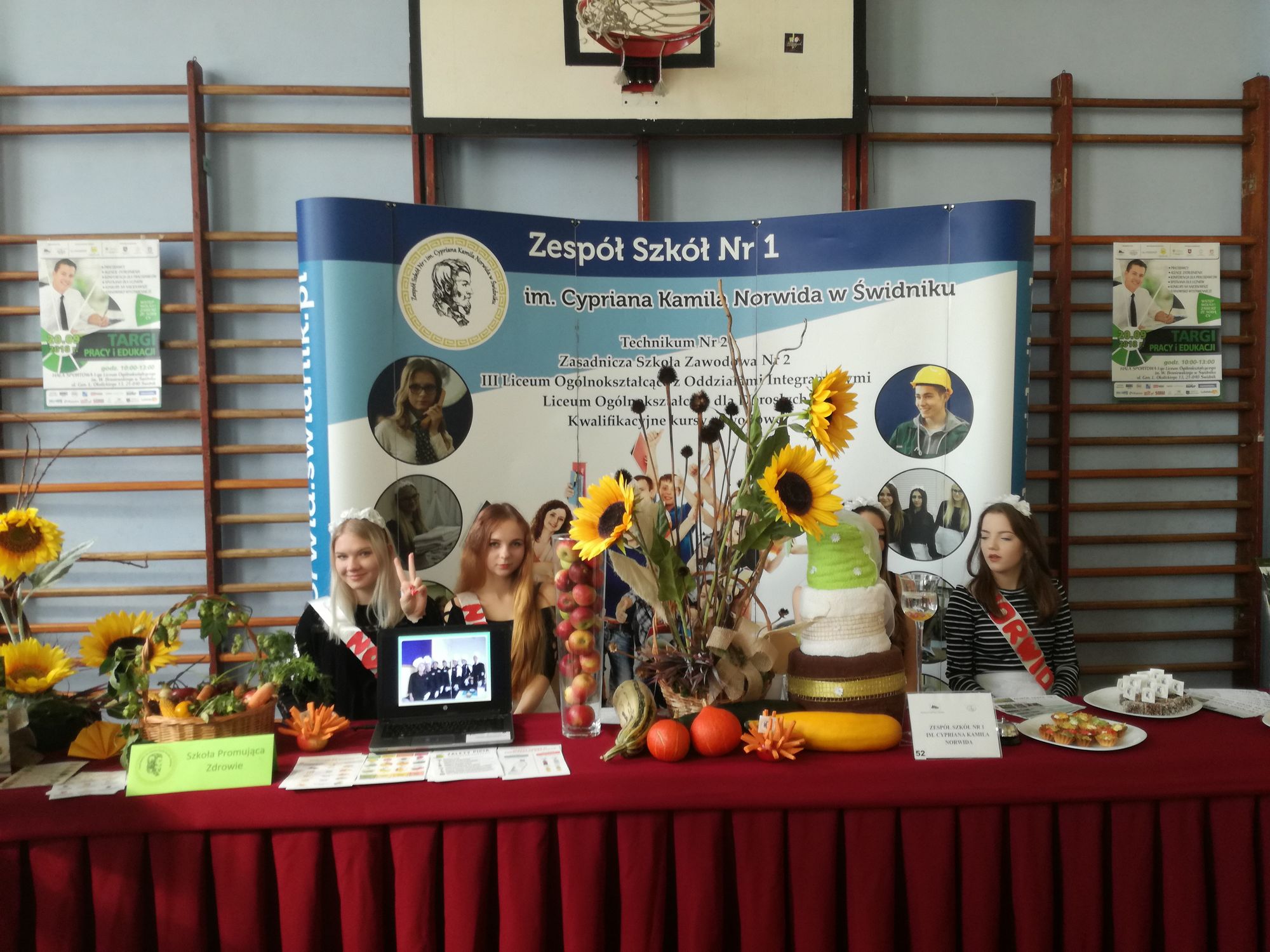 Zespół Szkół Nr 1 im. C. K. Norwida w Świdniku uczestniczył w Targach Pracy i Edukacyjnych, podczas których prezentowana była oferta edukacyjna naszej szkoły. Oprócz kierunków kształcenia na stoisku promowano program „Szkoły Promującej zdrowie”. Uczniowie drugiej klasy Technik żywienia i usług gastronomicznych obsługiwali bufet przygotowany dla gości imprezy. W trakcie targów odbył się konkurs na najciekawsze stoisko wystawiennicze, w którym nasza szkoła zajęła I miejsce . Nagrodę w imieniu szkoły odebrał Dyrektor Krzysztof Gałan z Panią Monika Bąk i uczennicami z klasy II TTH.