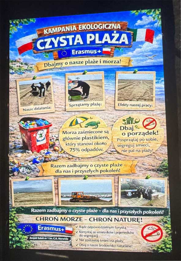 Co przyniósł im ten dzień? 🎨 Art-Eko w akcji: Wspólnie przygotowali krótką formę artystyczną poświęconą ochronie środowiska. Pokazali, że o planecie potrafią mówić z pasją i artystycznym zacięciem! 📚 Praca projektowa: Dzień upłynął im także na kontynuowaniu prac nad materiałami edukacyjnymi. 🏖️ Zasłużony reset: Po warsztatach przenieśli się na plażę w Cattolice. Gry w piłkę, kąpiele w Adriatyku i długie spacery pozwoliły im zregenerować siły przed kolejnymi wyzwaniami.
