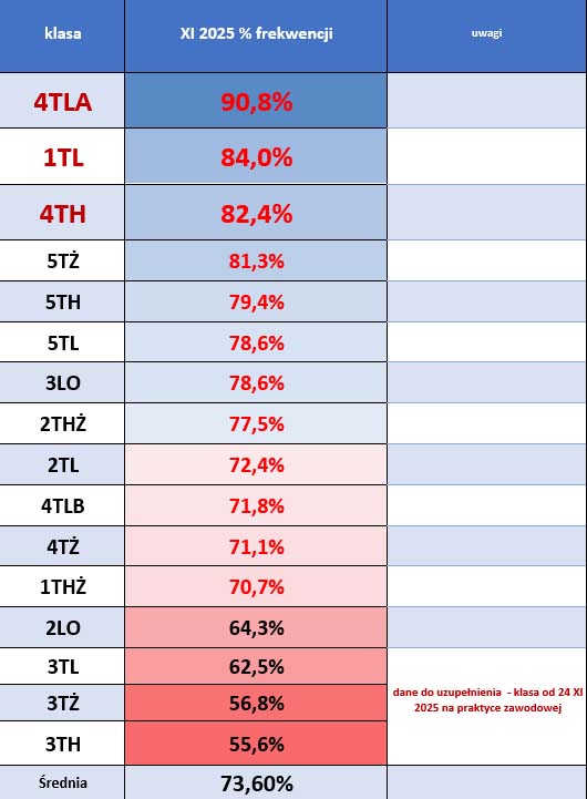 Najwyższą frekwencję w listopadzie 2025 r. uzyskały klasy - 4 TLA, 1 TL, 4 TH.