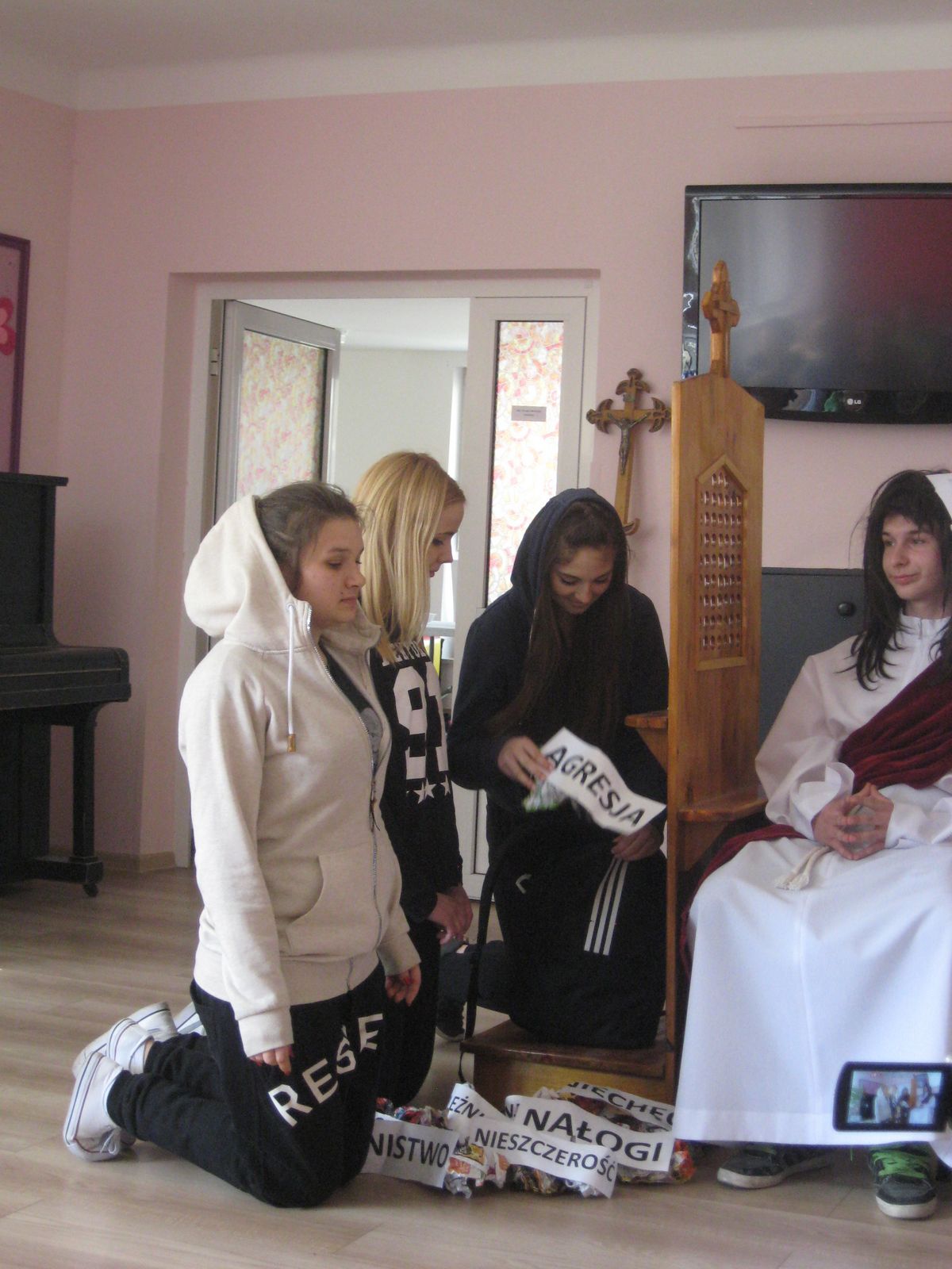 05.04.2016r. uczniowie ze Szkolnego Klubu Wolontariatu wraz z opiekunami Agnieszką Mazurek oraz ks. Grzegorzem Gutem odwiedzili podopiecznych Polskiego Stowarzyszenia na Rzecz Osób Upośledzonych Umysłowo Koło w Świdniku. Było to już kolejne spotkanie młodzieży „Norwida" z podopiecznymi PSOUU. Tym razem wolontariusze przygotowali dla zgromadzonej widowni misterium pasyjne „Zaniósł na krzyż nasze grzechy".